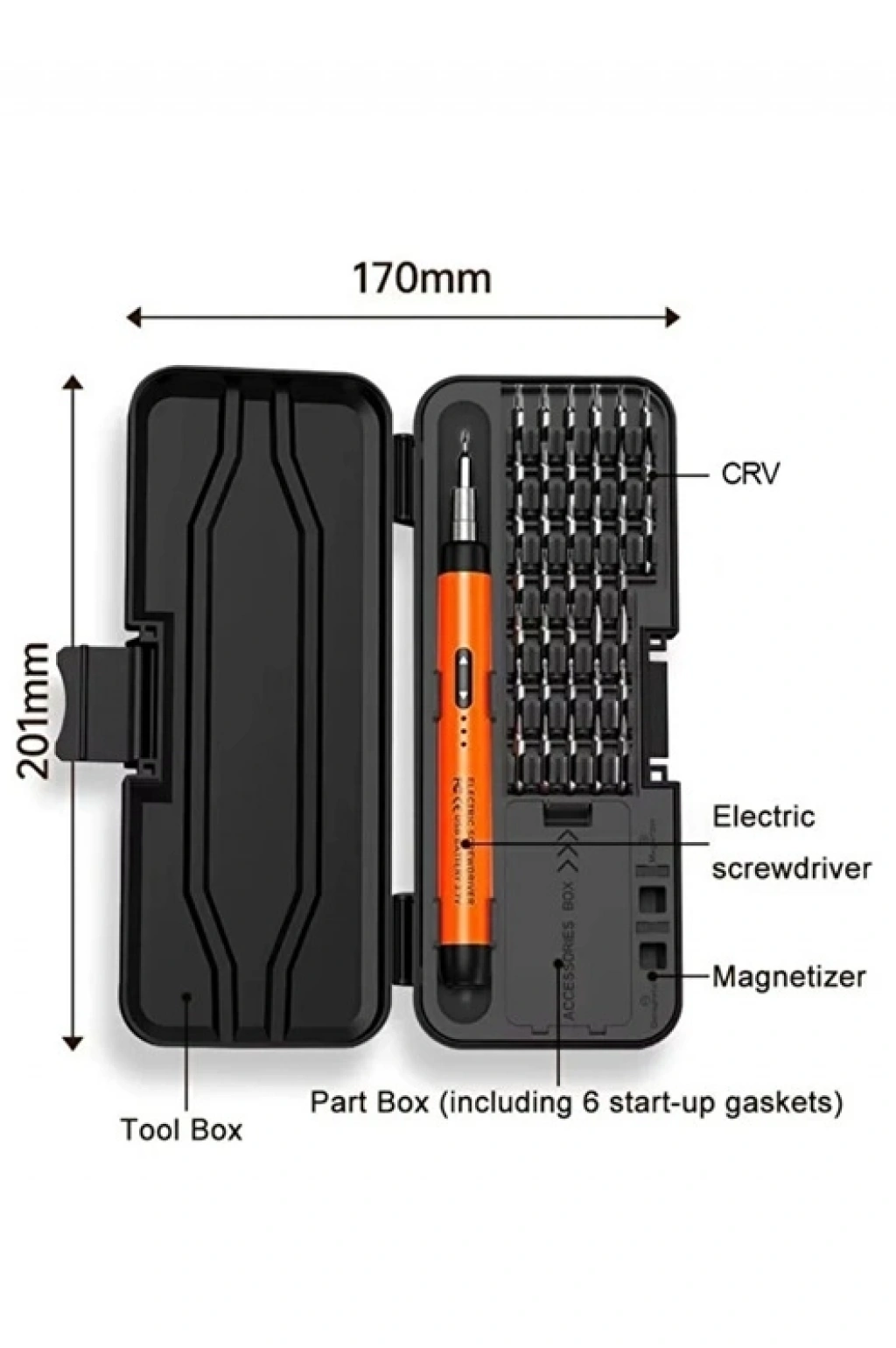 ÜRÜN AÇIKLAMASI Profesyonel Hassas Elektrikli Tornavida Seti Elektronik tamir, telefon sökme, laptop bakımı, saat ve gözlük onarımı için tasarlanmış kompakt ve güçlü mini elektrikli tornavida seti.