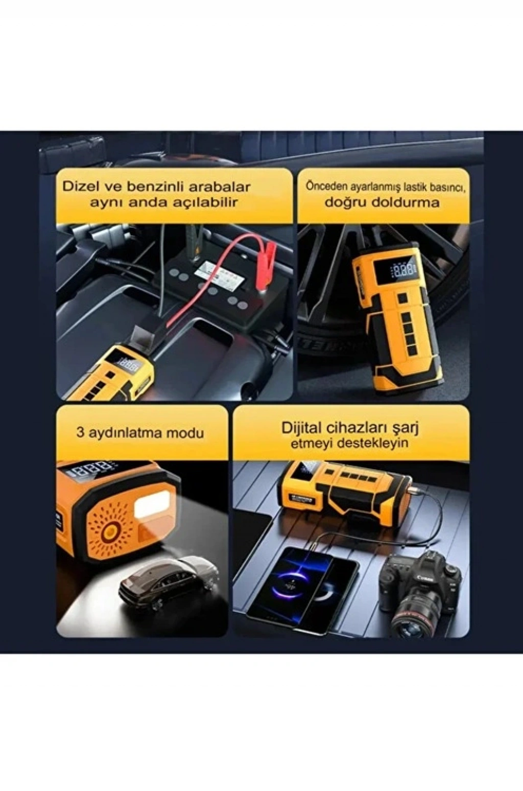 Yolda kalmaya son! Bu kompakt cihaz; Akü Takviye (Jump Starter),Hava Kompresörü, Powerbank ve LED Fener özelliklerini tek bir gövdede topluyor. Hem otomobilinizde hem de kamp ve seyahatlerinizde en büyük yardımcınız olacak.