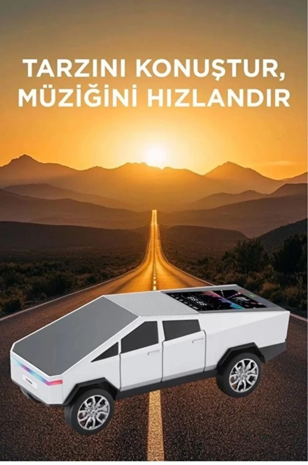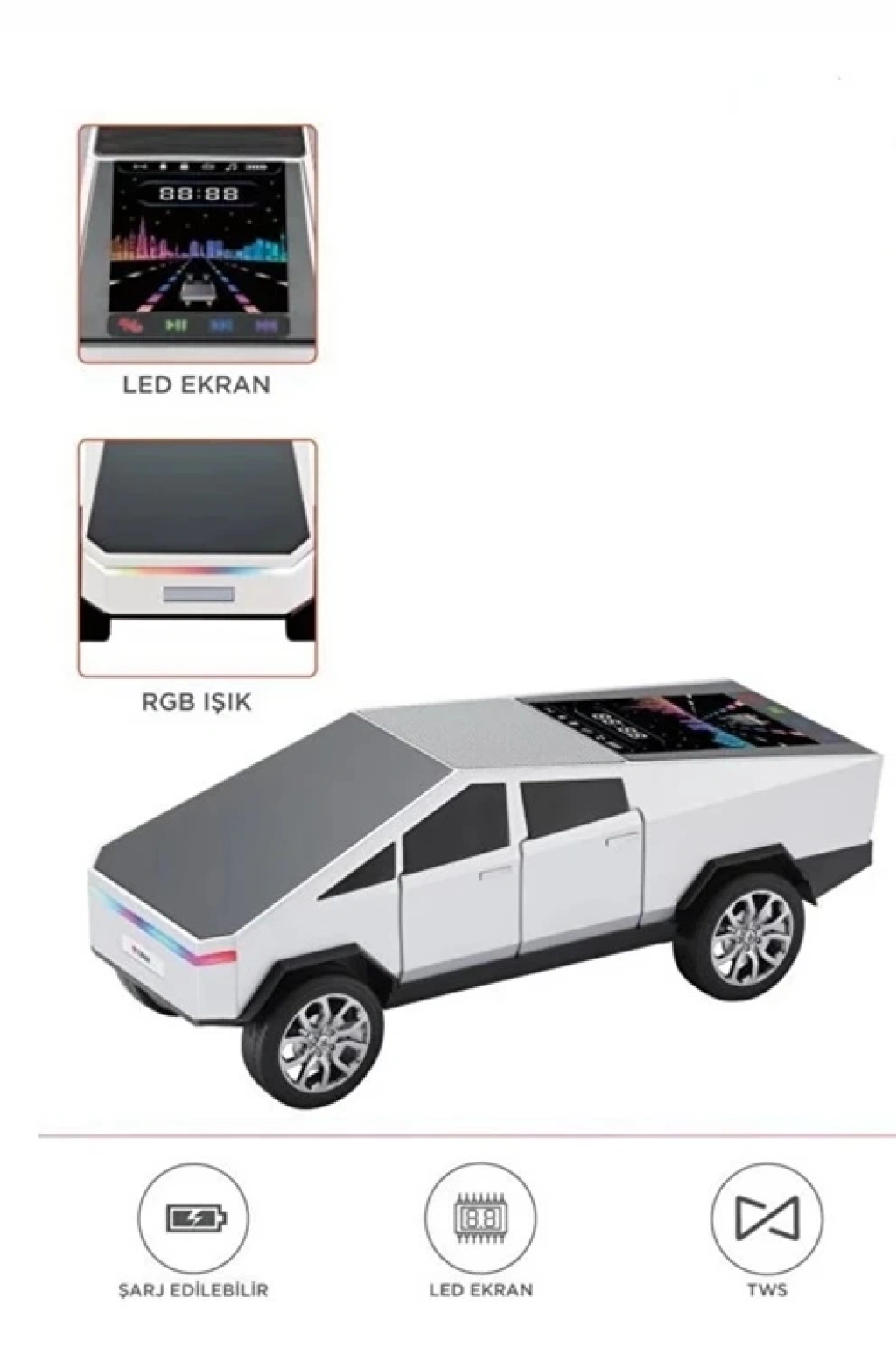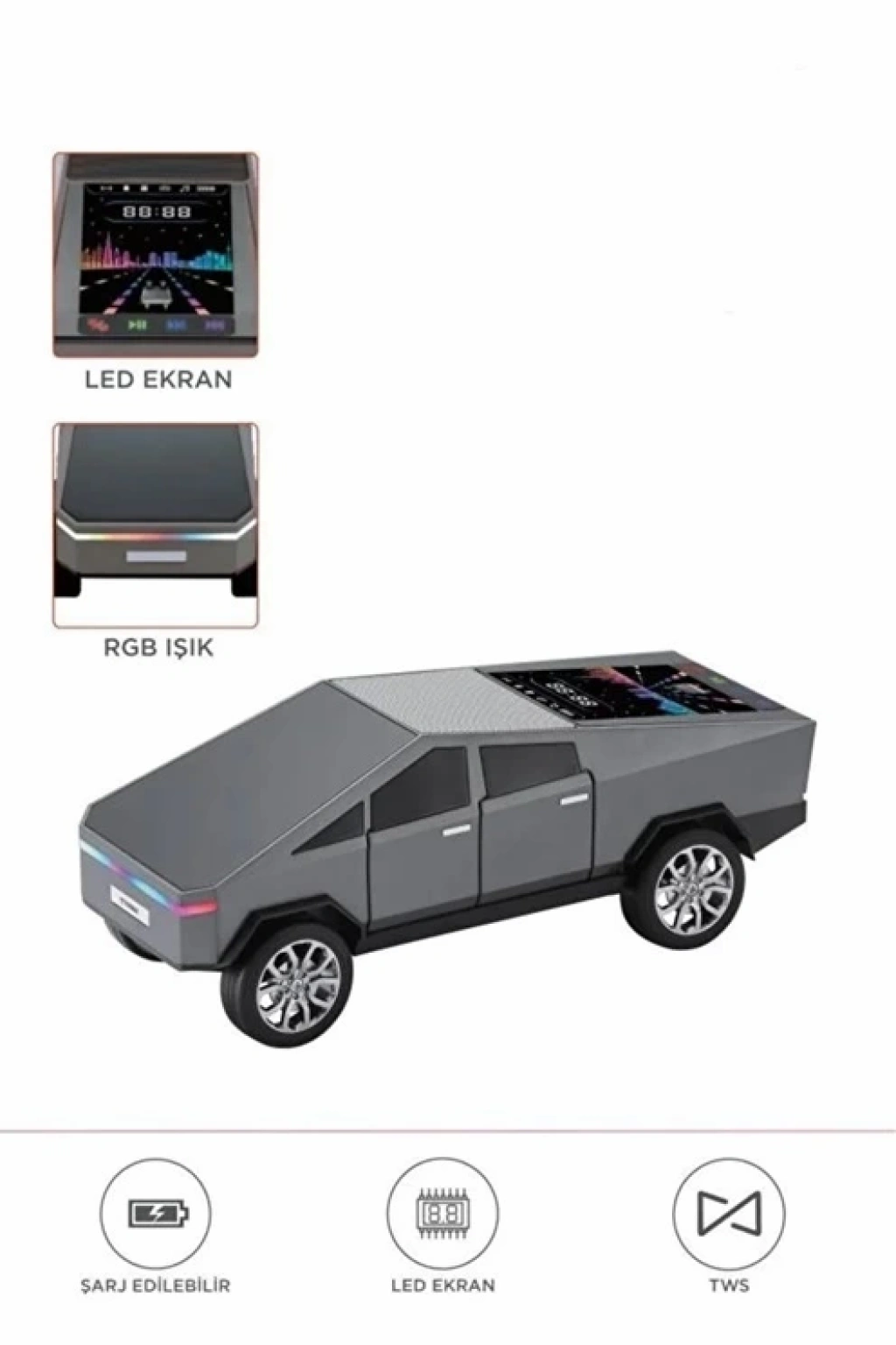 Araba Tasarımlı Bluetooth Hoparlör 15W Güçlü Ses RGB LED /TWS/USB kablosuz hoparlör ile müziğinizi yollara taşıyın! Modern CyberTruck esintili tasarımıyla dikkat çeken bu hoparlör, sadece bir ses cihazı değil, aynı zamanda şık bir aksesuar.