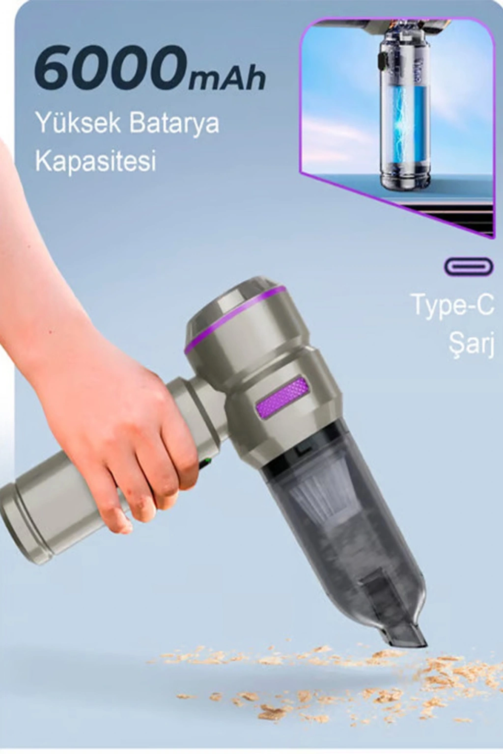 6000mAh Dev Batarya: Type-C hızlı şarj desteği ile kesintisiz temizlik özgürlüğü sunar.