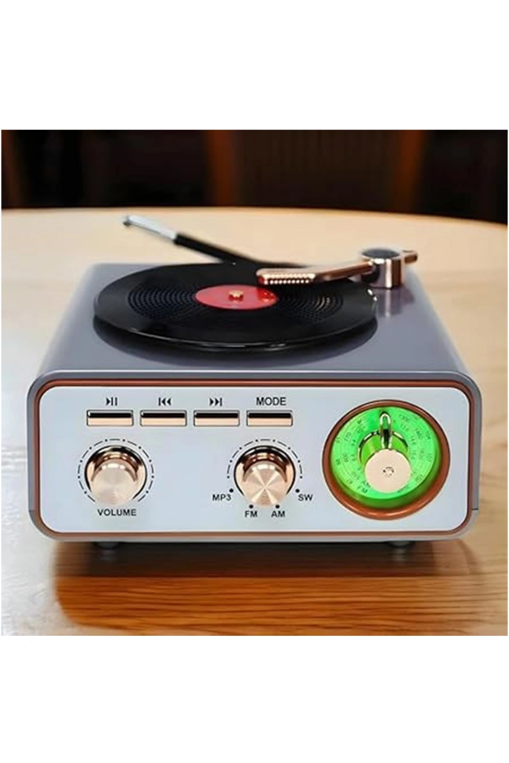 Özellikle retro dekorasyon sevenler için harika bir hediye seçeneği. Plak çalar iğnesi görünümündeki detaylar ve analog ayar düğmeleri, dijitalin soğukluğunu kırıp evinize sıcak bir hava katıyor."