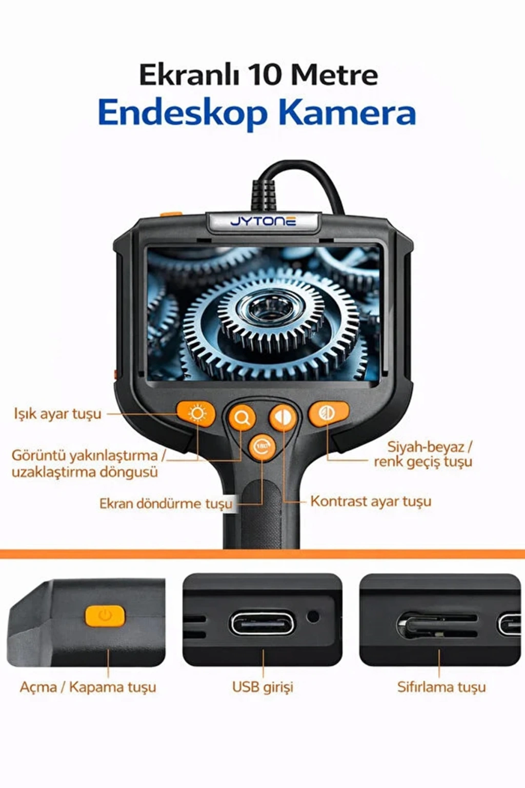 5.5mm Lens 4.3" IPS Ekranlı 10 Metre Sert Kablolu Endoskop Kamera – IP67 Su Geçirmez