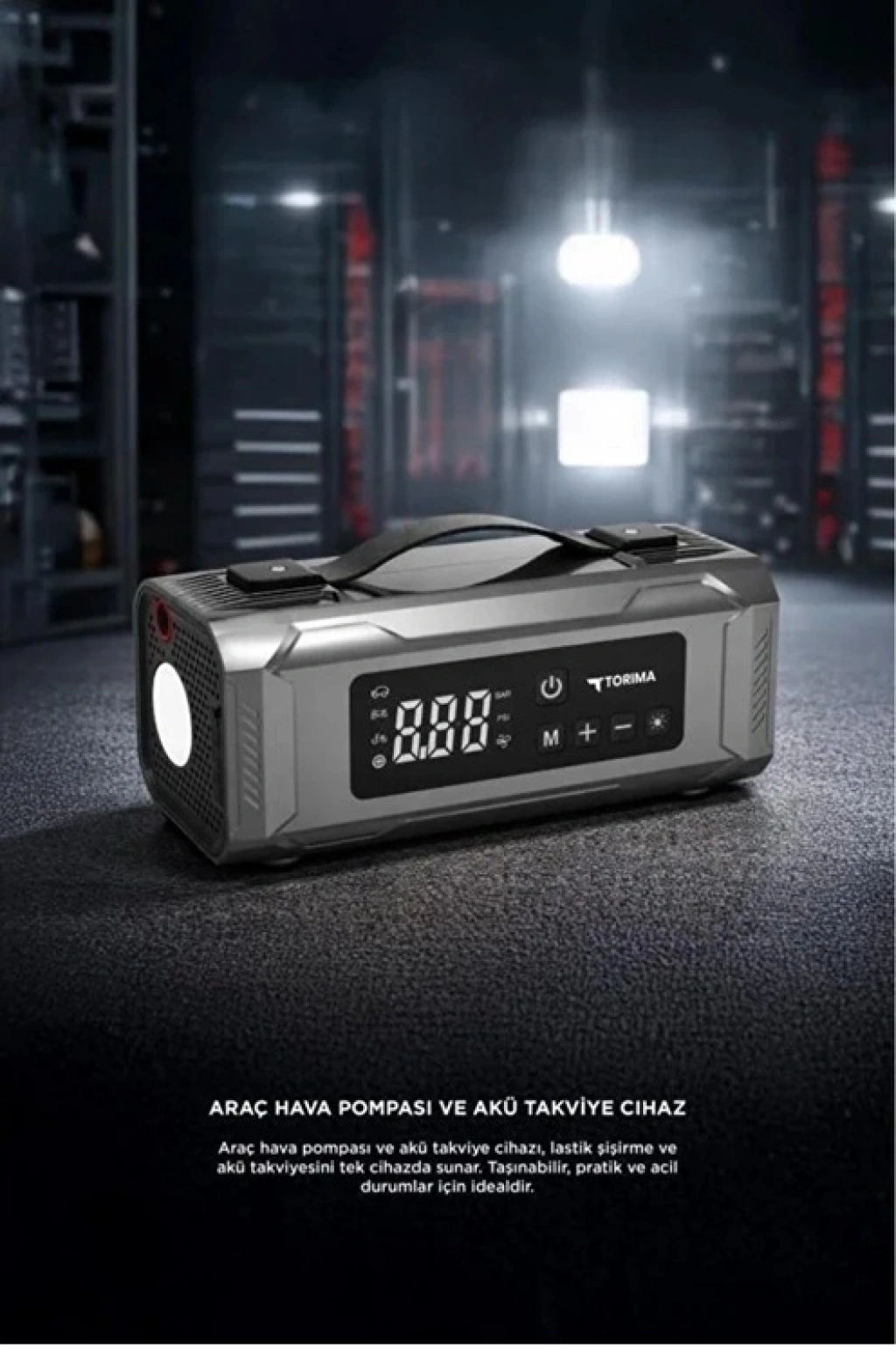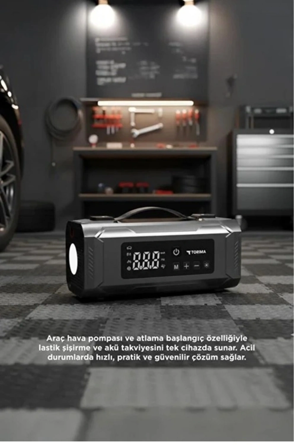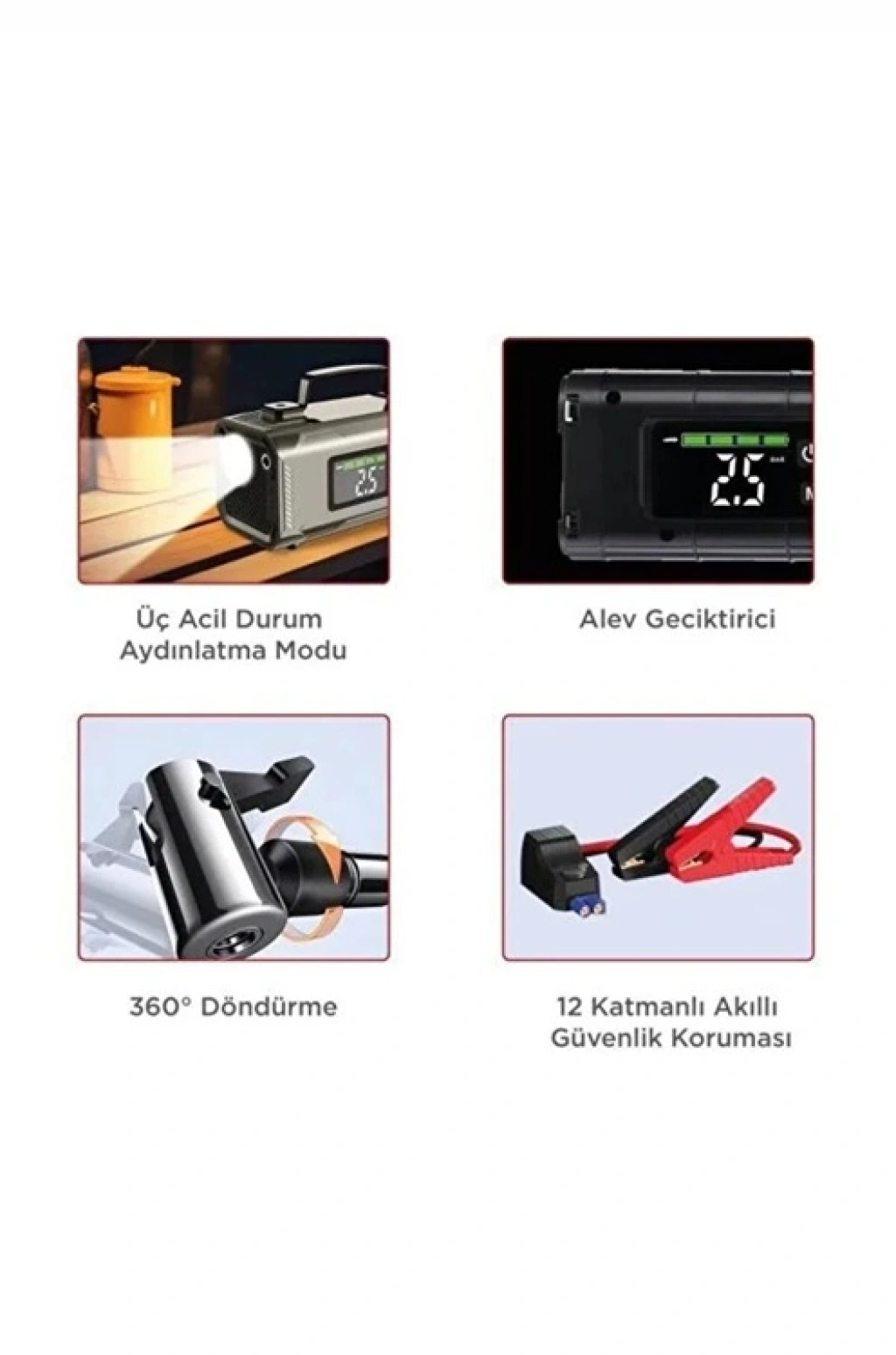 Yolda başınıza gelebilecek tüm aksiliklere karşı tek bir cihazla hazırlıklı olun! Bu kompakt ama güçlü cihaz; hem aracınızın aküsü bittiğinde onu canlandırır hem de inen lastiklerinizi saniyeler içinde şişirir. Üstelik güçlü powerbank özelliği ile telefonunuzu, feneriyle yolunuzu aydınlatır.