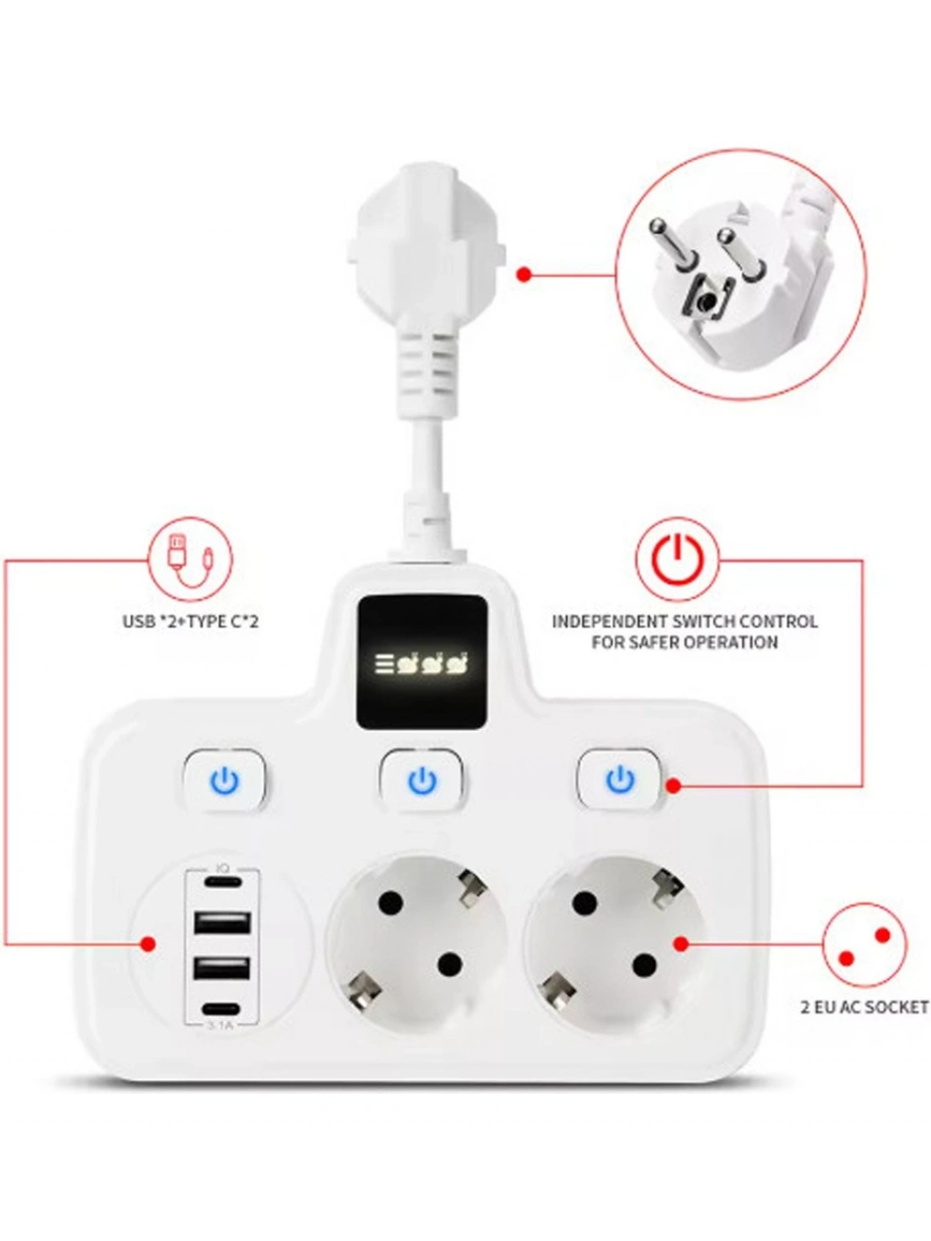 Ürün Özellikleri Tablosu Özellik Detay Priz Sayısı 2 Adet Standart Soket USB Çıkışları 2x USB-A + 2x Type-C Maksimum Güç 3250 Watt Koruma Tipi Termal Akım ve Yüksek Voltaj Koruması Kullanım Şekli Duvar Tipi (Kablo Kalabalığı Yapmaz) Uyumluluk Telefon, Tablet, Laptop ve Yüksek Güçlü Ev Aletle