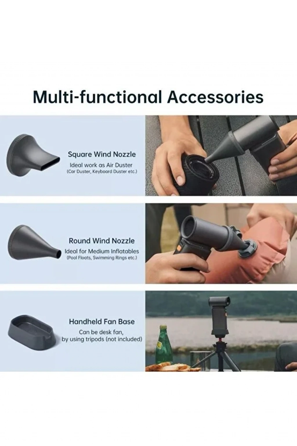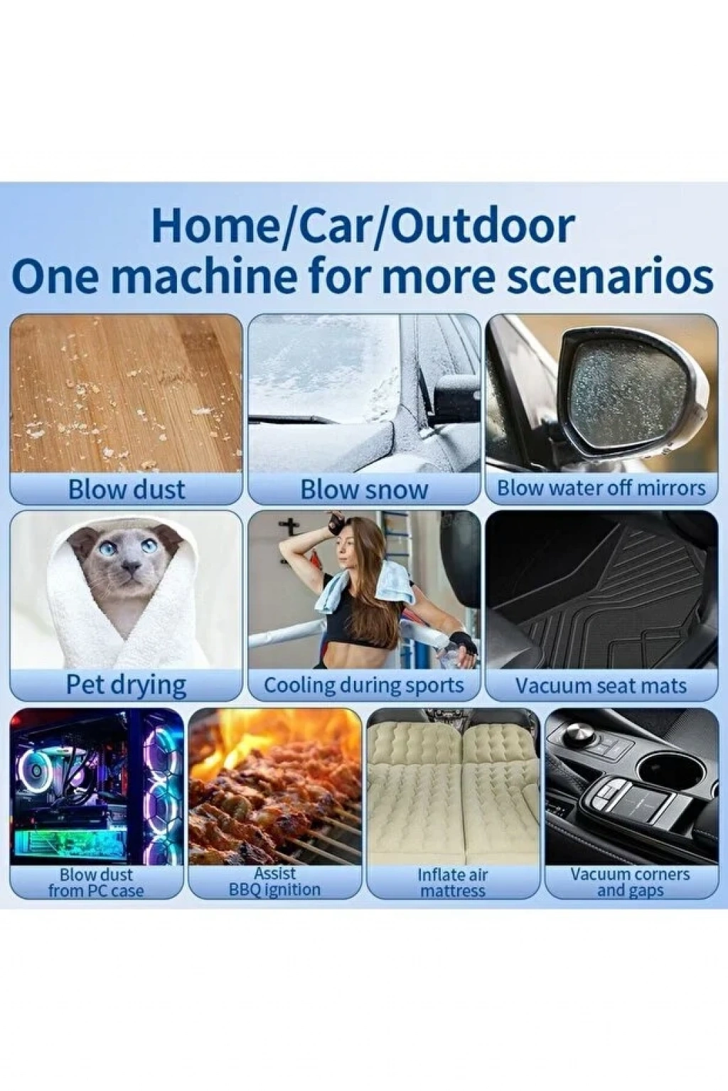 Çok Amaçlı: Sadece ev ve araba temizliğiyle sınırlı kalmaz; mangal yakma (barbekü fanı),lastik/deniz yatağı şişirme ve evcil hayvan tüyü toplama gibi işlerde de kullanılır.